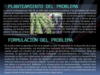 Este documento presenta un proyecto para el diseño de un centro de acopio comunal de hortalizas en la zona norte de Colombia. El proyecto busca fortalecer la cadena de valor agrícola mediante la mejora de los procesos productivos y la identificación de cuellos de botella. Se realizó un estudio de mercado que determinó una demanda insatisfecha de 1.228 toneladas anuales en la región. El centro de acopio permitiría almacenar, empacar y distribuir de manera más eficiente las 35 tonel