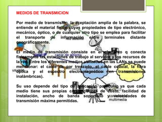 Este documento describe varios medios de transmisión utilizados en redes de computadoras. Explica que los medios guiados como el cable de par trenzado, el cable coaxial y la fibra óptica transportan señales a través de un cable físico, mientras que los medios no guiados como las microondas y las ondas de radio transmiten señales a través del espacio sin un cable. También compara las ventajas y desventajas de los diferentes medios, destacando que la fibra óptica ofrece mayor ancho de banda pero es más cost