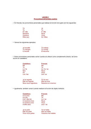 Este documento presenta un curso de francés dividido en 46 lecciones. Las lecciones cubren temas gramaticales como pronombres personales, verbos como "ser" y "haber", artículos, nombres, adjetivos, tiempos verbales como el presente e imperfecto, y más. Cada lección incluye vocabulario relevante al tema gramatical correspondiente.