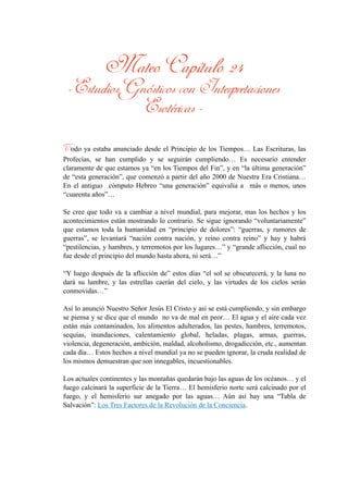Este documento resume las profecías del Evangelio de Mateo capítulo 24 sobre los últimos tiempos y la segunda venida de Cristo. Señala que ya estamos viviendo los principios de dolores que incluyen guerras, desastres naturales y degeneración moral, y que la generación actual está presenciando el cumplimiento de estas profecías. También advierte sobre falsos profetas y la necesidad de encarnar a Cristo interiormente a través de la práctica espiritual.