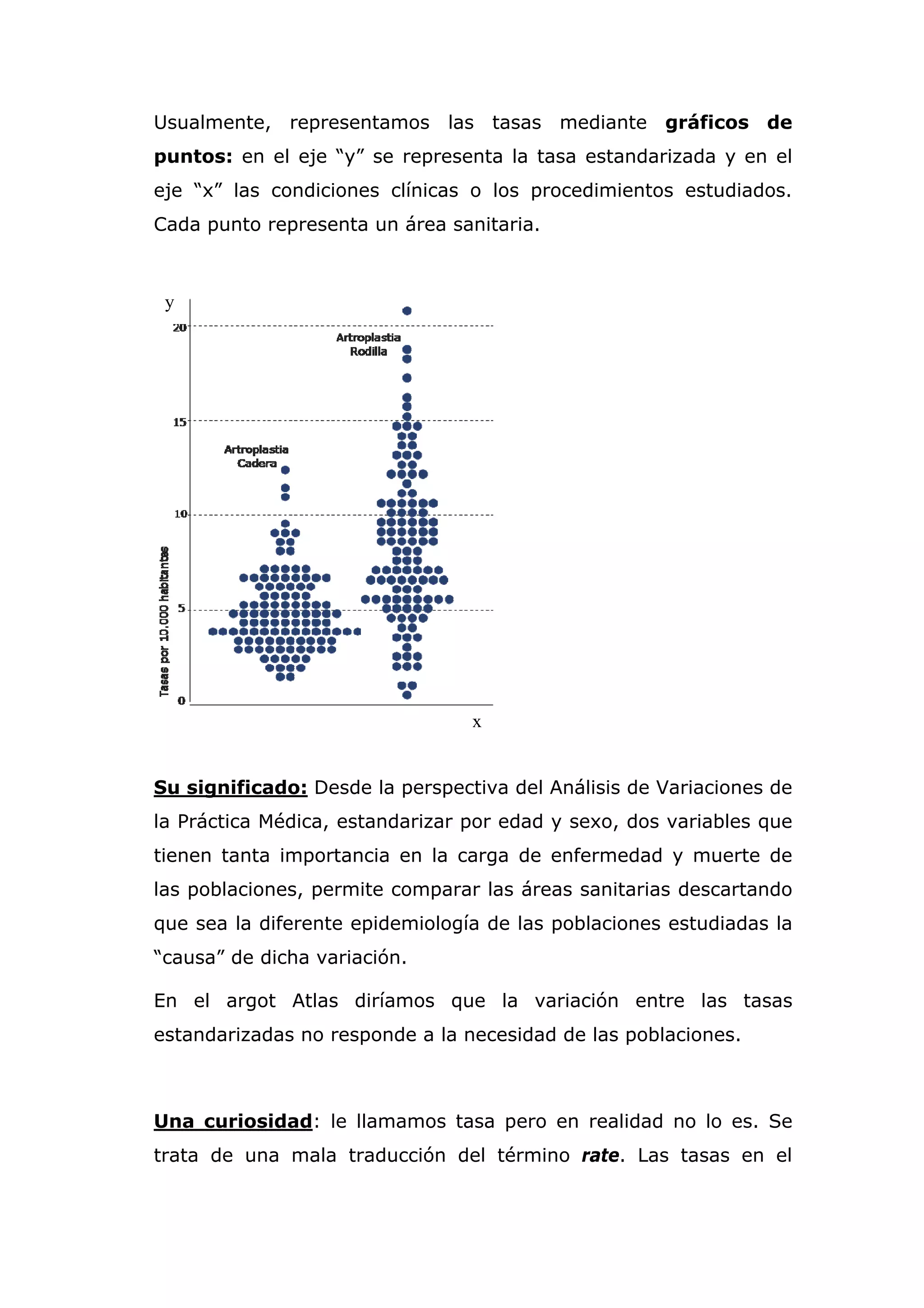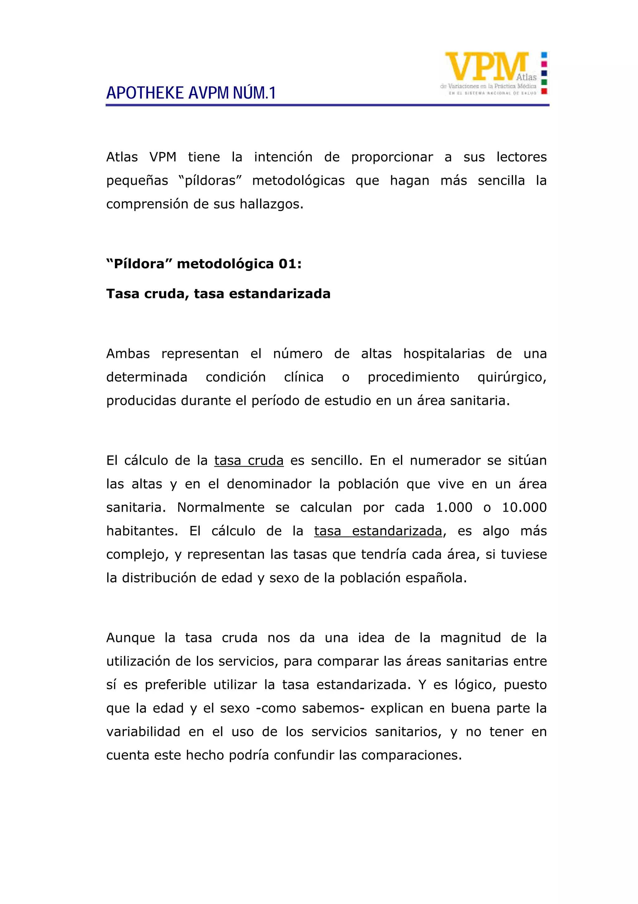 El documento ofrece explicaciones sobre las tasas cruda y estandarizada de altas hospitalarias, destacando su importancia en la comparación entre áreas sanitarias. La tasa cruda es fácil de calcular, mientras que la estandarizada ajusta las cifras según la edad y el sexo de la población, lo que permite un análisis más preciso. Se enfatiza que, aunque se utilizan términos como 'tasas', su aplicación en el documento no corresponde exactamente a la definición matemática de tasa.
