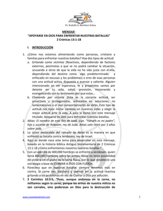 Este documento resume un mensaje bíblico sobre cómo el rey Abías de Judá se apoyó en Dios para enfrentar una batalla contra un ejército mucho más grande de Israel. Abías clamó a Dios con fe y tocó las trompetas, en lugar de depender de su propia fuerza militar. Como resultado, Dios derrotó al ejército de Israel. El documento insta a los lectores a apoyarse en Dios de la misma manera para enfrentar sus propias batallas, en lugar de depender de sus propias fuerzas o quejar