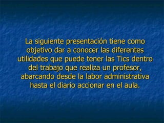 Las TICs pueden apoyar la gestión educativa tanto en tareas administrativas como en el trabajo en el aula. En la labor administrativa, las TICs ayudan a calcular notas, porcentajes y promedios. En el aula, las TICs sirven para planificar clases, crear presentaciones con PowerPoint, y usar pizarras interactivas para hacer las clases más entretenidas. También pueden usarse blogs para que los estudiantes y apoderados interactúen sobre temas de aprendizaje.