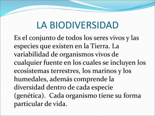 Este documento describe la biodiversidad y sus orígenes evolutivos. Explica que la biodiversidad incluye diversidad genética, de especies y de ecosistemas. Detalla las teorías de Lamarck y Darwin sobre la evolución y proporciona evidencias como registros fósiles, anatomía comparada, embriología y bioquímica que apoyan la teoría de la evolución.