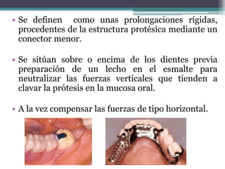 Los apoyos oclusales se definen como prolongaciones rígidas de la estructura protésica que se sitúan sobre los dientes para transmitir fuerzas funcionales y evitar el movimiento de la prótesis. Sus principales funciones son transmitir fuerzas oclusales a los dientes, impedir que la prótesis se desplace y mantener la retención. Pueden clasificarse según su ubicación ucolsal o incisal y el material sobre el que se apoyan, como el esmalte, amalgama u oro. Un diseño y preparación adecuados son cruciales