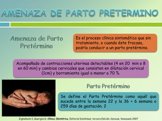 El documento presenta información sobre el parto pretérmino, incluyendo sus definiciones, causas, síntomas, tratamientos y complicaciones. Se define el parto pretérmino como aquel que ocurre entre las 22 y 36 semanas de gestación. Los tratamientos para detener el parto prematuro incluyen medicamentos como los β-agonistas, sulfato de magnesio y nifedipina. Las complicaciones para el recién nacido prematuro pueden incluir dificultad respiratoria y enterocolitis necrotizante.
