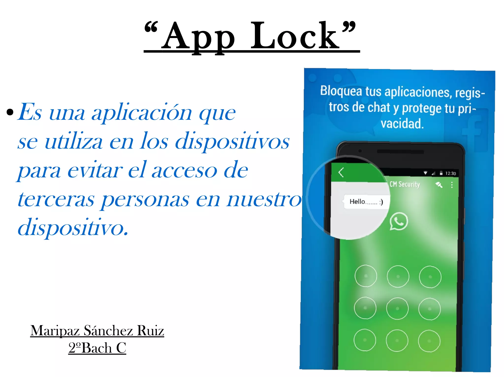 La aplicación "app lock" permite proteger dispositivos evitando el acceso no autorizado mediante bloqueo de aplicaciones y funciones. Además, incluye opciones como rastreo en caso de robo, notificaciones de intentos fallidos de acceso y diversas configuraciones de seguridad. Los usuarios pueden personalizar métodos de desbloqueo y gestionar qué aplicaciones desean proteger.