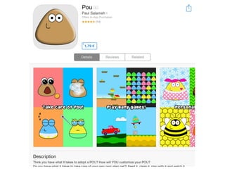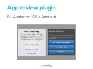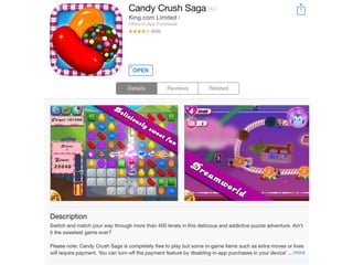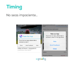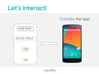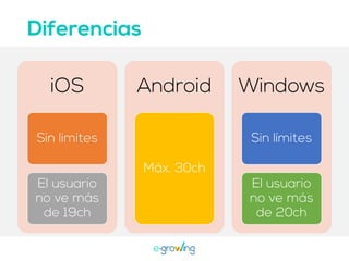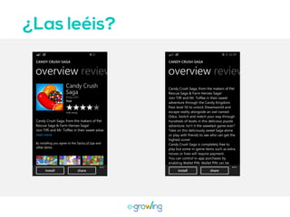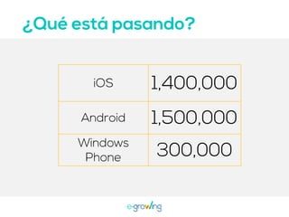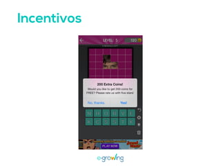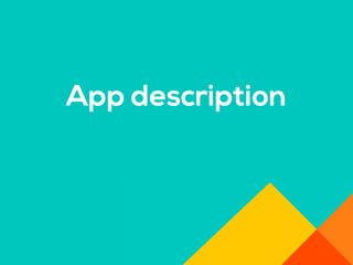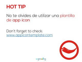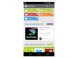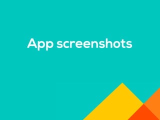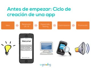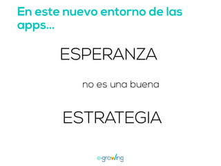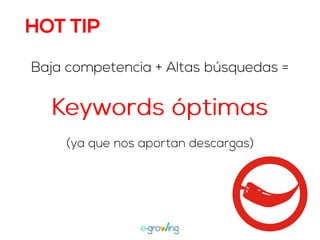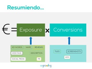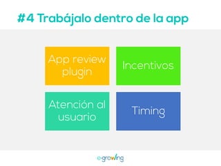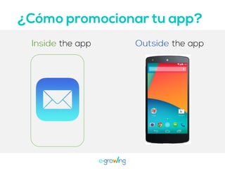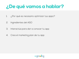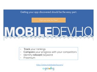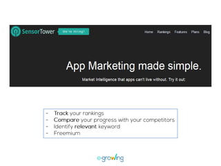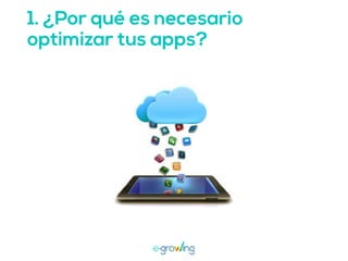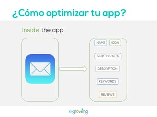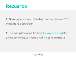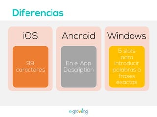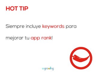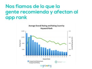 El documento aborda la importancia de las palabras clave para mejorar la visibilidad y el ranking de aplicaciones. Se mencionan estrategias como la invención de palabras clave, brainstorming, investigación y el uso de herramientas profesionales. Una mejor visibilidad se traduce en más descargas de la aplicación.