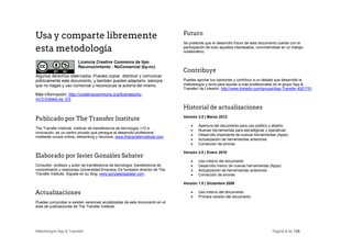 El documento presenta una metodología para organizar oficinas de transferencia de tecnología universitarias llamada App & Transfer!. La metodología consta de 4 bloques: (A) dinámica de la transferencia, (B) estrategia, (C) implementación y (D) comunidad de mejora. El bloque A describe 3 etapas del proceso de transferencia: detección de oportunidades, interacción con empresas y conversión en clientes, e incluye herramientas para cada etapa.