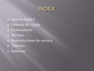Apple es una empresa estadounidense que revolucionó la tecnología con ordenadores, reproductores de música, teléfonos inteligentes y tabletas. Fue fundada en 1976 por Steve Jobs y Steve Wozniak. Apple creó el primer ordenador personal Apple I y luego el Apple II, y ahora ofrece los ordenadores Mac con el sistema operativo macOS. También creó el reproductor de música iPod en 2001, los teléfonos inteligentes iPhone en 2007 y las tabletas iPad en 2010.