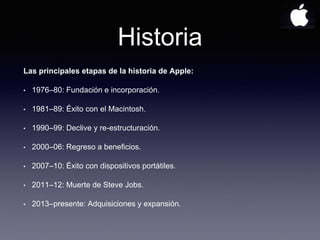 La historia de Apple comenzó en 1976 y ha pasado por varias etapas como su fundación, éxito con el Macintosh, declive y reestructuración, y recientemente ha tenido éxito con dispositivos móviles como el iPhone e iPad. Apple produce productos como el Mac, iPhone, iPad, iPod, Apple TV y Apple Watch. Su estrategia de marketing se enfoca en crear fans en lugar de solo clientes para mantener su lealtad a la marca a través de acciones y campañas publicitarias influyentes.