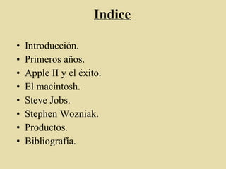 Apple es una empresa estadounidense fundada en 1976 por Steve Jobs y Steve Wozniak. Sus principales productos incluyen los ordenadores Macintosh, el reproductor de música iPod, el teléfono inteligente iPhone y la tableta iPad. Jobs y Wozniak diseñaron la computadora Apple I en un garaje en 1971 y fundaron oficialmente la compañía en 1976. El éxito del Apple II en 1977 llevó a la compañía a la cima de la industria de las computadoras personales.