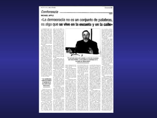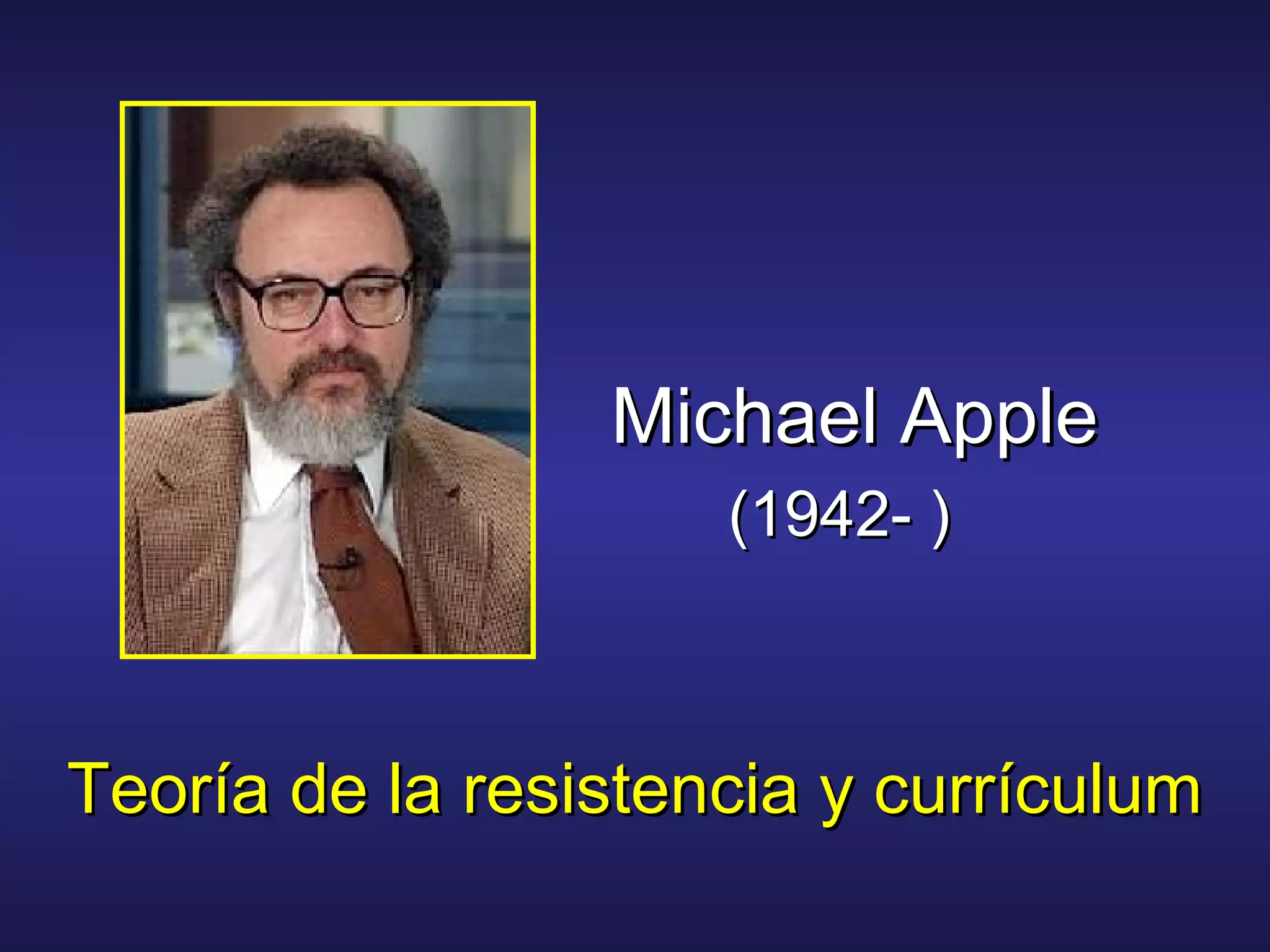 Michael Apple es un teórico estadounidense de la educación nacido en 1942 conocido principalmente por su teoría de la resistencia y su análisis crítico del currículum escolar. Propone que el currículum reproduce las desigualdades de poder en la sociedad y aboga por reformarlo para incluir cultura crítica y conocimiento que permita a los estudiantes comprender y cuestionar las tradiciones intelectuales. También destaca el papel de los maestros en resistirse a la imposición de orientaciones en el currículum
