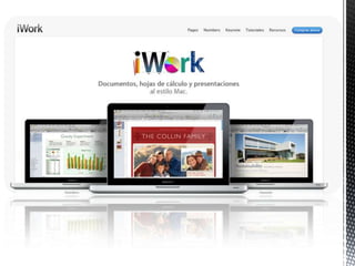 Este documento proporciona información sobre la historia y productos de Apple Inc. Detalla 1) el origen de la compañía fundada por Steve Jobs y Steve Wozniak, 2) los principales dispositivos electrónicos que han lanzado como el iPhone, iPad, iPod, y software como iOS, Mac OS X, y 3) algunas de las aplicaciones incluidas en sus suites como iLife y iWork.