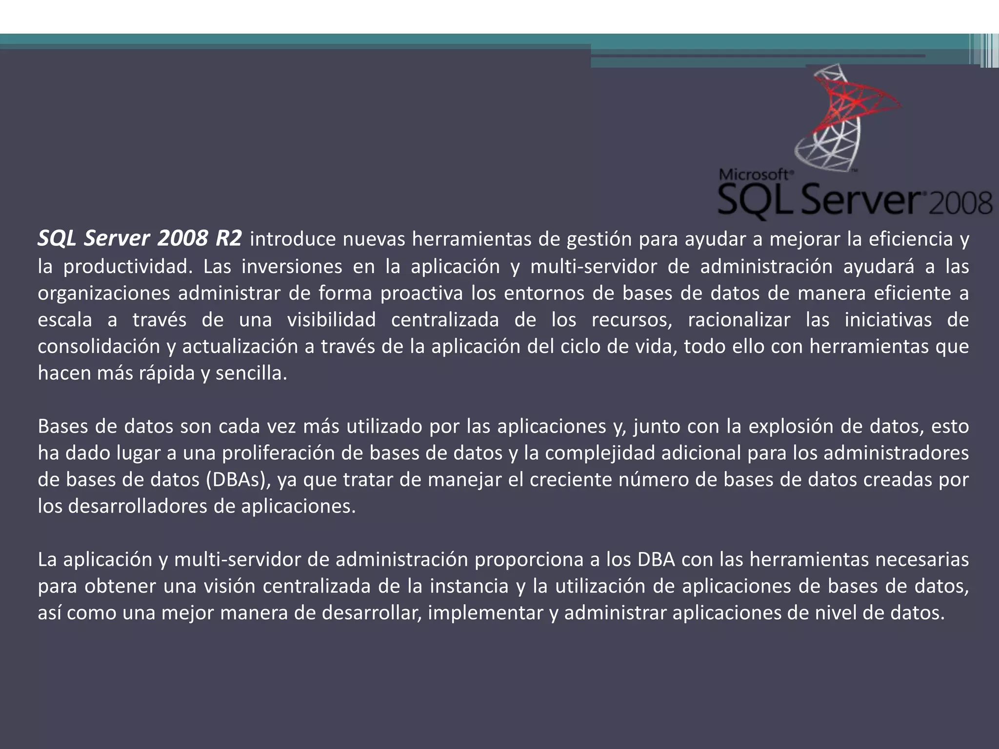 SQL Server 2008 R2 introduce nuevas herramientas para administrar de forma más eficiente los entornos de bases de datos a gran escala, incluyendo la administración de aplicaciones y servidores múltiples. Estas herramientas proporcionan visibilidad centralizada de los recursos y las aplicaciones de bases de datos para facilitar la consolidación y mejorar la eficiencia en todo el ciclo de vida. Un concepto clave es el punto de control de servicios que permite ver instancias y bases de datos desde una sola ubicación. Las aplicaciones de capa de datos agiliz