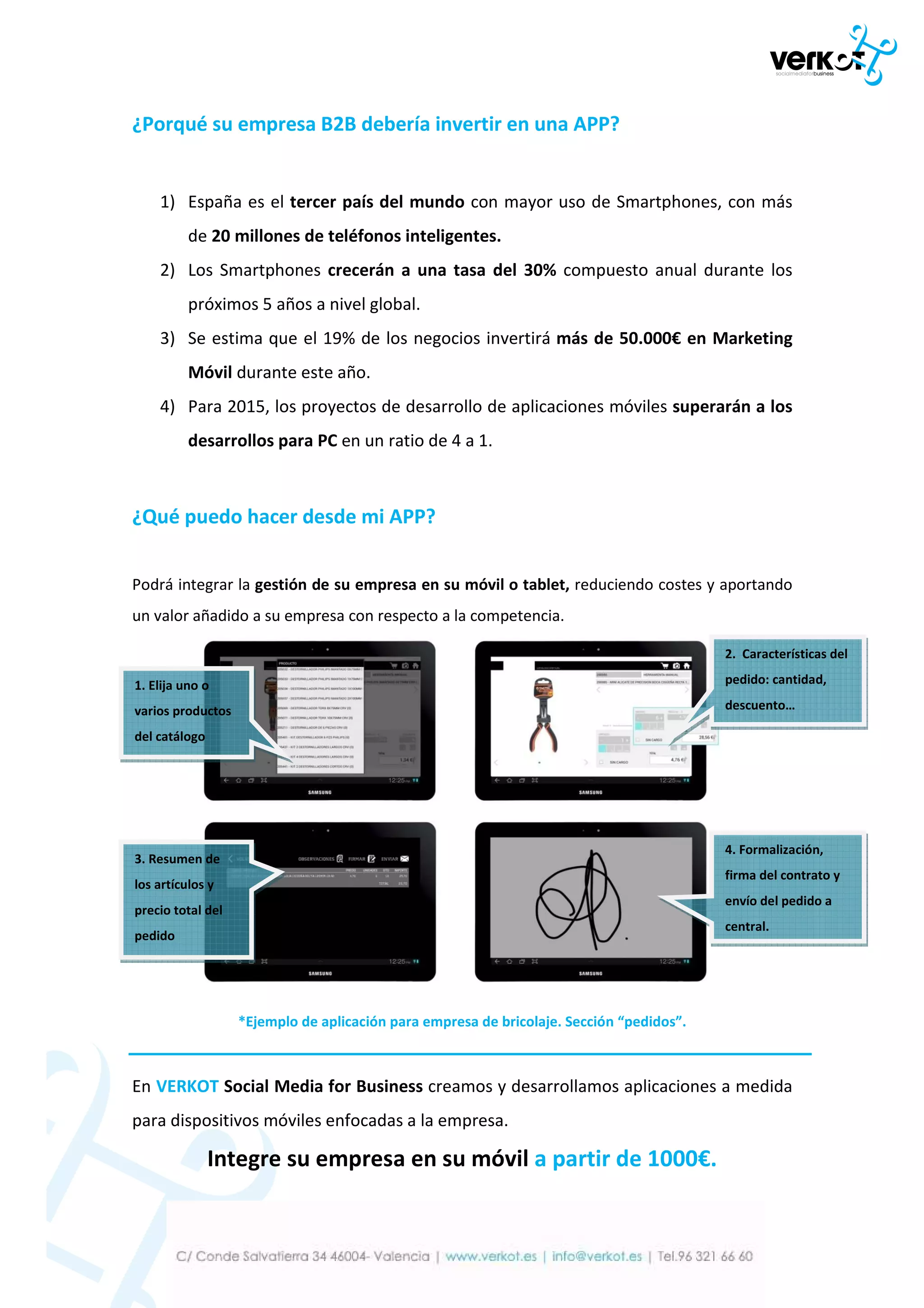 La inversión en una aplicación móvil para empresas B2B es recomendable dado que España tiene más de 20 millones de usuarios de smartphones, cuyo uso crecerá a una tasa anual del 30% en los próximos 5 años. Además, el 19% de las empresas invertirá más de 50.000€ en marketing móvil este año y para 2015 los desarrollos para aplicaciones móviles superarán a los de escritorio 4 a 1.