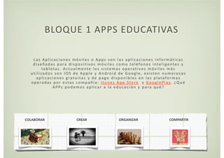 Este documento describe varias aplicaciones educativas ("apps") que pueden usarse para colaborar, crear contenido y organizar el trabajo. Entre las apps descritas se incluyen Google Drive para el almacenamiento en la nube y el trabajo colaborativo; blogs y plataformas como WordPress y Blogger; Skype y Hangouts de Google para videollamadas y reuniones virtuales; mapas interactivos como Google Maps; y realidad aumentada para añadir capas de información al mundo físico.