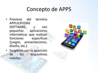 Este documento describe las aplicaciones móviles (apps) y su potencial uso en la educación. Explica que las apps son pequeñas aplicaciones que realizan funciones específicas, surgidas con los dispositivos móviles. También describe las características, plataformas y tiendas de apps, e indica que existen más de 80,000 aplicaciones educativas que pueden facilitar la labor del docente.