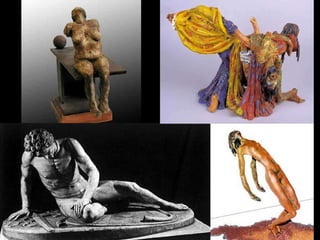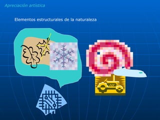 El documento describe los diferentes elementos y factores que componen la apreciación artística. Explica los elementos primarios como el punto, la línea y el plano, y cómo estos se manifiestan en la pintura y la escultura. También describe los elementos secundarios como la forma, figura y composición. Además, analiza factores como el ritmo, proporción, simetría y dirección, y los diferentes efectos comunicativos como lo mimético, ornamental y expresivo.