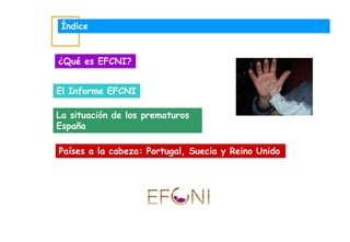 El documento resume el Informe EFCNI sobre la situación de los niños nacidos prematuros en España. Según el informe, España carece de una política nacional dirigida a la salud neonatal y los lactantes prematuros, a diferencia de países como Portugal y Reino Unido. También señala deficiencias como la falta de programas de prevención y seguimiento a largo plazo, así como escasez de personal médico especializado. El informe concluye pidiendo mejoras como aumentar la formación, el seguimiento de prematuros y el apoyo a