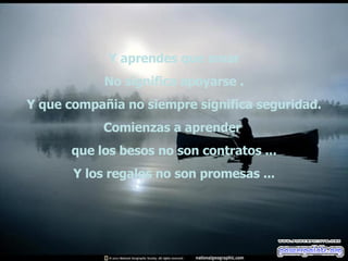 Este documento ofrece consejos sobre las lecciones de la vida que se aprenden con el tiempo. En resumen, sugiere que con el tiempo aprendemos que amar no significa depender del otro, que los regalos y besos no son promesas, y que debemos seguir adelante con una sonrisa ante las derrotas en lugar de la tristeza. También aprendemos que el futuro es incierto y que debemos valorar a nuestros amigos y familiares en el presente.