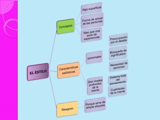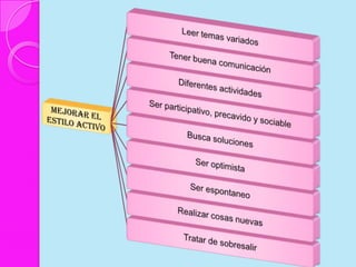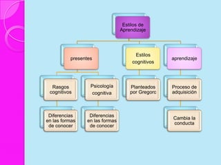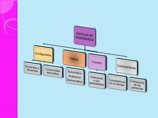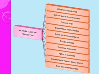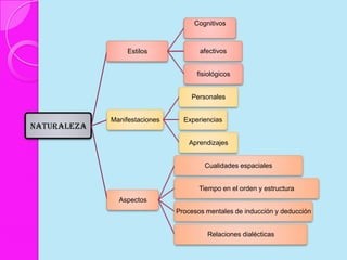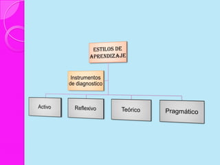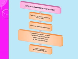 Este documento discute los estilos de aprendizaje, incluyendo la teoría sinérgica de Adam, taxonomías de estilos de aprendizaje, y cómo los estilos se relacionan con aplicaciones didácticas. También cubre la evaluación de estilos de aprendizaje a través de cuatro etapas y ofrece recomendaciones para mejorar los estilos de aprendizaje del alumno y estrategias de enseñanza según diferentes estilos.