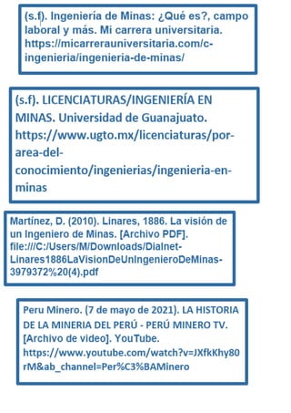 La minería en el Perú tiene una larga historia que se remonta a las culturas preincaicas, quienes desarrollaron diversas herramientas y técnicas para extraer y procesar metales como el oro, la plata y el cobre. Los incas expandieron la minería a gran escala y explotaron una gran variedad de metales para su imperio. Durante la colonia, los españoles se enfocaron principalmente en la extracción de oro y plata, muchas veces de forma cruel y desorganizada. En la época republicana, la