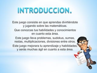 El documento presenta un juego educativo sobre matemáticas diseñado para que los estudiantes aprendan divirtiéndose. El juego contiene problemas, sudokus, sumas, restas, multiplicaciones y divisiones con el objetivo de mejorar las habilidades y el aprendizaje de los estudiantes en matemáticas de una manera entretenida.