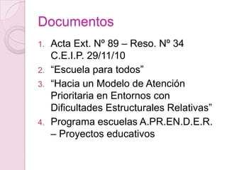 Este documento presenta el programa APRENDER para escuelas ubicadas en contextos de pobreza en Argentina. Los objetivos son garantizar el acceso y éxito escolar de todos los estudiantes y mejorar los aprendizajes a través de proyectos educativos colaborativos. El programa asigna recursos adicionales a las escuelas y promueve la participación de las familias y la comunidad.