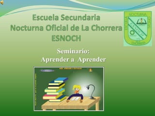 El documento presenta la información del personal administrativo y académico de la Escuela Secundaria Nocturna Oficial de La Chorrera. Incluye los nombres y cargos del director, subdirectora, inspectores, bibliotecóloga y secretarias. Además, describe brevemente algunos temas tratados en un seminario sobre aprender a aprender, como los fundamentos legales de la educación en Panamá, la historia del colegio y consejos para mejorar el aprendizaje.