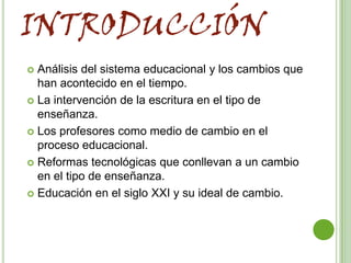 El documento trata sobre la evolución de los modelos educativos, desde las culturas orales hasta la educación del siglo XXI. Explica que a pesar de las nuevas teorías cognitivas del aprendizaje, es difícil llevar los cambios a la práctica debido a que la educación está arraigada en nuestra herencia cultural. Finalmente, concluye que solo las mentes capaces de guiar su propio aprendizaje y el de los demás podrán adaptar la educación a los nuevos tiempos.