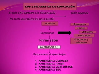 Este documento describe los 4 pilares de la educación propuestos por la UNESCO para el siglo XXI: 1) Aprender a conocer, centrado en adquirir instrumentos de saber y autonomía intelectual; 2) Aprender a hacer, vinculado a la formación profesional y el desarrollo de competencias; 3) Aprender a vivir juntos a través del conocimiento mutuo y la cooperación; y 4) Aprender a ser, contribuyendo al desarrollo global de cada persona y dotándolos de autonomía de pensamiento.