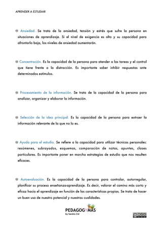 Este documento ofrece consejos sobre cómo mejorar el estudio. Explica que la actitud, motivación y control del tiempo son factores que afectan el aprendizaje. También señala que la ansiedad, concentración, procesamiento de información y habilidades para resumir son importantes para estudiar de manera efectiva. Además, proporciona 10 pasos clave como crear un espacio de estudio sin distracciones, planificar el tiempo, tomar notas, leer de manera activa y entrenar la atención y memoria.