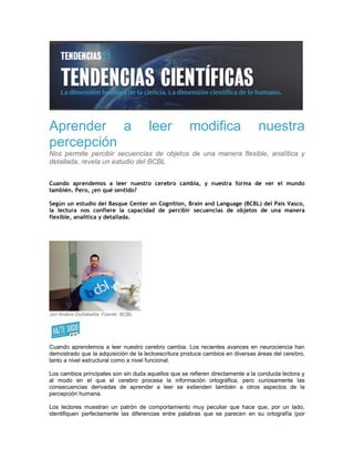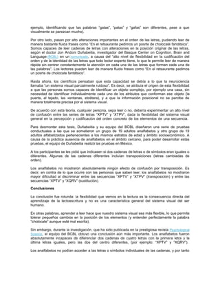 El documento describe un estudio que encontró que aprender a leer cambia la forma en que percibimos secuencias de objetos, permitiéndonos analizarlas de manera más flexible y detallada. El estudio comparó la capacidad de analfabetos y personas alfabetizadas para distinguir cadenas de letras con transposiciones, y encontró que solo los alfabetizados podían hacerlo de manera efectiva. Esto demuestra que la flexibilidad visual en la lectura se debe al aprendizaje de la lectura, no es una característica general del sistema visual.