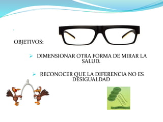 Este documento describe la importancia de mirar la salud desde una perspectiva más amplia que reconozca las desigualdades sociales. Señala que al mirar profundamente las tragedias, el dolor y las injusticias se puede entender mejor cómo la salud no se distribuye de manera equitativa entre países ricos y pobres, así como entre diferentes grupos sociales dentro de una sociedad. Concluye que para comprender realmente las desigualdades en salud es necesario considerar factores políticos, culturales y sociales en lugar de enfocarse sólo en