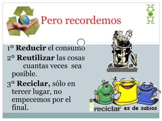 Este documento habla sobre la importancia de reducir, reutilizar y reciclar para disminuir la cantidad de residuos. Recomienda adquirir solo lo necesario, usar productos locales para ahorrar en transporte, evitar bolsas de plástico y sobreembalajes, y darle un segundo uso a los objetos antes de desecharlos. También explica qué tipo de materiales van en cada contenedor de basura como restos de comida en el de orgánica.