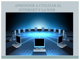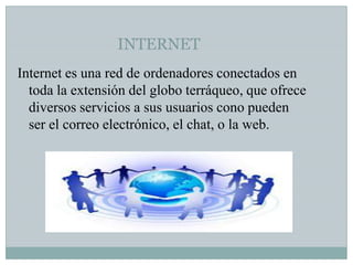 Internet es una red global de ordenadores que ofrece servicios como correo electrónico, chat y la web. La web se basa en documentos llamados páginas web escritas en HTML y enlazadas mediante hipervínculos, que permiten navegar entre ellas usando un navegador. Existen buscadores que indexan páginas web por palabras clave y facilitan su localización. El correo electrónico permite enviar y recibir mensajes de forma rápida mientras que el chat sólo es posible si ambas partes están conectadas simultáneamente.