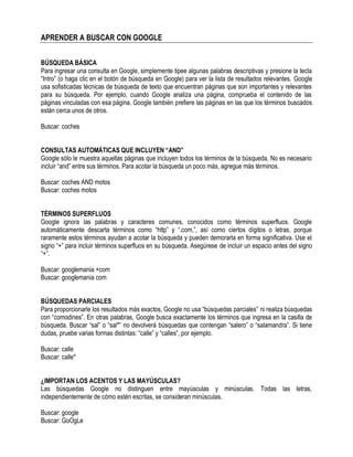 El documento ofrece una guía sobre cómo realizar búsquedas efectivas en Google. Explica conceptos básicos como realizar búsquedas simples, usar operadores lógicos como AND y OR, excluir términos, buscar frases exactas, restringir dominios y usar comodines. También cubre temas avanzados como palabras clave especiales en Google y búsquedas concretas como definiciones, archivos PDF, corrección ortográfica e información financiera.