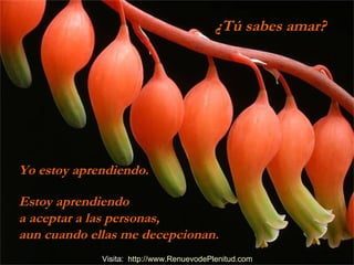 El documento trata sobre el proceso de aprendizaje de aceptar y amar incondicionalmente a las personas, a pesar de sus defectos y decepciones. El autor describe estar aprendiendo a escuchar con empatía, perdonar los errores de los demás, y descubrir el valor intrínseco en cada persona más allá de las apariencias. Aunque es un proceso lento y difícil, el autor está comprometido a continuar esforzándose por amar a los demás como Dios los ama.