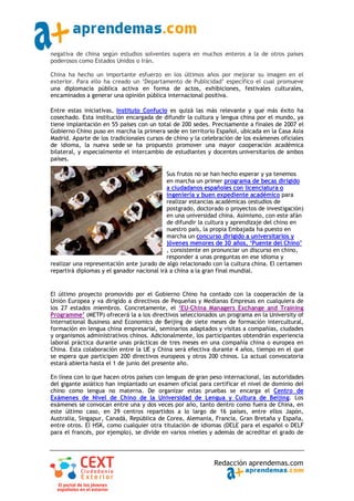 El documento habla sobre el creciente interés en España por aprender chino. Cada vez más personas están aprendiendo chino bien en colegios, universidades o centros de idiomas. Aprender chino requiere trabajo y disciplina, y muchos expertos recomiendan una inmersión lingüística en China para dominar el idioma. China está promoviendo activamente la difusión del chino en el mundo a través de iniciativas como el Instituto Confucio.
