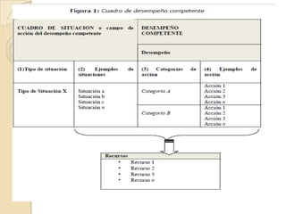 Este documento describe un enfoque para el desarrollo de programas de estudio basados en competencias. Propone definir competencias como estructuras dinámicas ancladas en situaciones contextualizadas, en lugar de objetivos o contenidos. Sugiere crear un banco de situaciones reales y tipos de situaciones, y analizar los recursos y acciones requeridas para cada situación. El objetivo es que los estudiantes desarrollen competencias a través de la resolución de situaciones, en lugar de memorizar conocimiento descontextualizado.