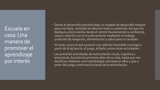 La autora describe su enfoque de educación en casa para sus dos hijos basado en el aprendizaje por interés y el uso de recursos educativos abiertos. Comenzó estimulando a sus hijos desde el vientre materno y ofreciéndoles actividades lúdicas de estimulación. Ahora, sus hijos de 12 y 14 años diseñan sus propios objetivos y actividades de aprendizaje usando recursos en línea como parte de una segunda fase enfocada en "Aprender para Transformar". Los recursos educativos abiertos les han permitido