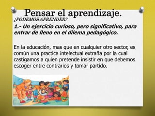 El documento discute diferentes perspectivas sobre el aprendizaje. Presenta 10 afirmaciones sobre el aprendizaje y la educación, y luego analiza algunas de estas afirmaciones. También explora conceptos como la identificación, el significado y la utilización como aspectos clave del aprendizaje, y cómo el maestro debe facilitar la interacción entre estos aspectos. Finalmente, discute cómo el aprendizaje a menudo es desconcertante e irregular, yendo de lo simple a lo complejo en lugar de de manera acumulativa.