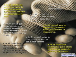 Este documento resume las lecciones aprendidas a diferentes edades de la vida, desde la niñez hasta la vejez. Algunas de las lecciones clave incluyen aprender que los problemas empiezan pequeños, no descargar frustraciones en otros, y que siempre se está aprendiendo algo nuevo incluso hasta una edad avanzada. El documento concluye que lo más importante no es la edad a la que se vive, sino sentir que la vida no se ha vivido en vano.
