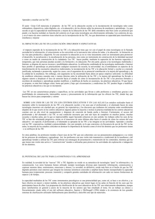Las TIC tienen el potencial de transformar la educación mejorando el aprendizaje y la enseñanza, pero su impacto depende del contexto y uso que se les dé. Si bien las TIC permiten nuevas formas de acceso al conocimiento, su incorporación a las aulas no siempre mejora los resultados educativos. Para aprovechar su potencial, es necesario que los docentes las integren de manera coherente con sus enfoques pedagógicos y que se estudie cómo modifican las prácticas educativas.