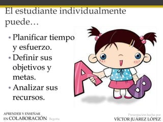 Este documento describe los beneficios del aprendizaje colaborativo. Explica que aunque los estudiantes pueden aprender individualmente, aprenden mejor cuando comparten información y conocimiento con otros. La colaboración permite debatir ideas, resolver problemas de forma conjunta, y considerar diferentes perspectivas culturales. El aprendizaje colaborativo es necesario debido a que en la vida real se aplican conocimientos de manera compleja entre varias personas.