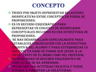 Los mapas conceptuales son herramientas esquemáticas que representan relaciones significativas entre conceptos para facilitar la comunicación con la estructura cognitiva del alumno. Ayudan a los estudiantes a visualizar conceptos, identificar relaciones y a construir proposiciones significativas, lo que potencia su aprendizaje al conectar nuevos conocimientos con lo que ya saben. Este proceso fomenta una comprensión más profunda al permitir la revisión y enriquecimiento del conocimiento existente.