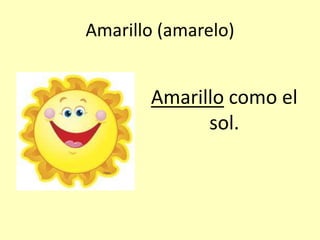 Este documento presenta una lista de colores comunes y sus nombres en portugués y español. Describe cada color y da ejemplos de cómo se usa o se ve en la naturaleza o en objetos. Los colores incluyen amarillo, azul, beige, blanco, gris, naranja, rosa, rubio, verde claro, verde oscuro, rojo, morado, marrón, negro y otros como azul marino, castaño, dorado, lila y plateado.