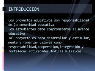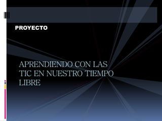 Este documento describe un proyecto para enseñar a los estudiantes a aprovechar su tiempo libre utilizando las TIC. El proyecto tiene como objetivo principal fomentar hábitos de recreación y lectura en los estudiantes mediante actividades lúdico-recreativas que utilicen las TIC. También busca despertar el interés de los niños por juegos de sano esparcimiento y fomentar el desarrollo de actividades que atraigan su atención.