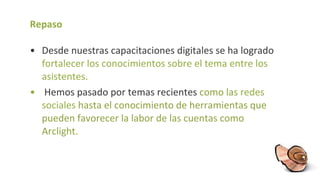 Este documento resume las presentaciones realizadas en un curso de aprendizaje digital entre marzo y julio de 2010. Se cubrieron temas como marketing en redes sociales, herramientas como Twitter y Facebook, y el rol del community manager. También incluyó discusiones sobre contenido web, SEO, y casos exitosos de clientes como Davivienda y Kellogg's aplicando estas estrategias digitales.